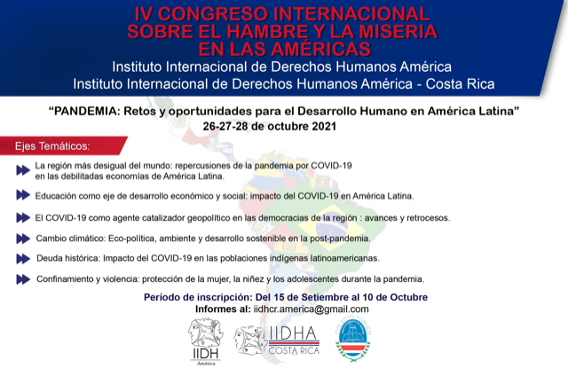 Ha concluído octubre y con este el IV Congreso Internacional Sobre Hambre y Miseria en las Américas, organizado, en esta ocasión, por el Capítulo costarricense de nuestro Instituto Internacional de Derechos Humanos. Dada la coyuntura que nos apremia, nuevamente el congreso se realizó de manera virtual, con sede en el canal de Youtube de susodicho capítulo.